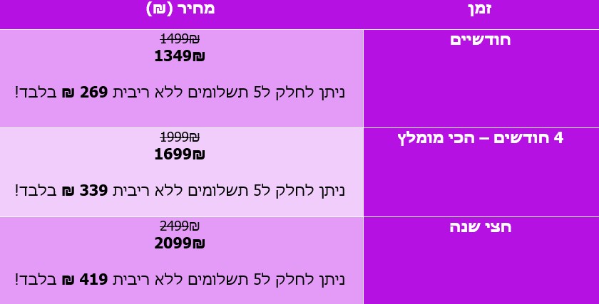 אפשרות לחלק עד 5 תשלומים ללא ריבית.